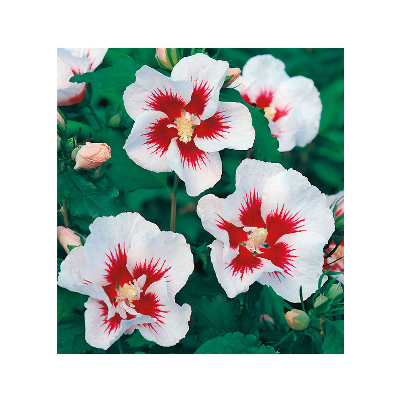 Superbe arbuste à longue floraison estivale et aux couleurs chatoyantes, blanc immaculé au coeur rouge.