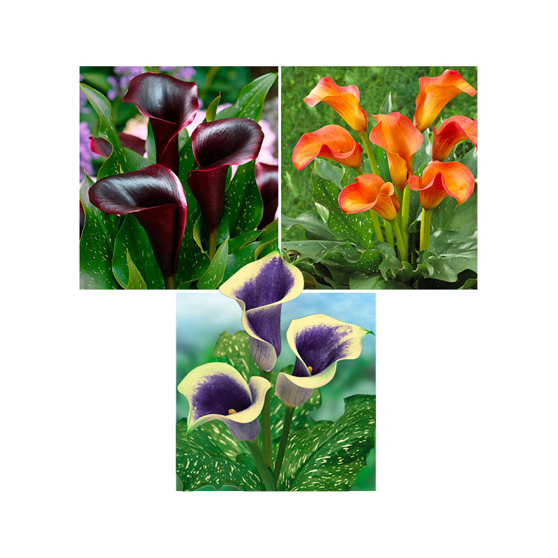 Idéaux en bouquet, d’une beauté incomparable, ils sont très appréciés dans les compositions florales. Avec leurs splendides spathes, pleines de fraîcheur, ils voquent l’exotisme. Cultivezles en potée ou en massif abrité. Leur feuillage décoratif est détruit par le gel mais la souche résiste bien au froid en la protégeant par un bon paillage. Calibre 14/+.