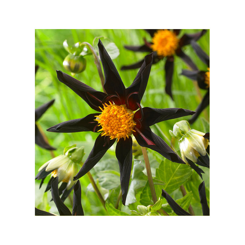 Originales : ses fleurs étoilées dites « d’orchidées », sont composées de 8 pétales effilés et incurvés pourpre foncé presque noir encerclant un cœur jaune d’or, créant un contraste sublime ! 11 cm de Ø. Idéales en bouquets.