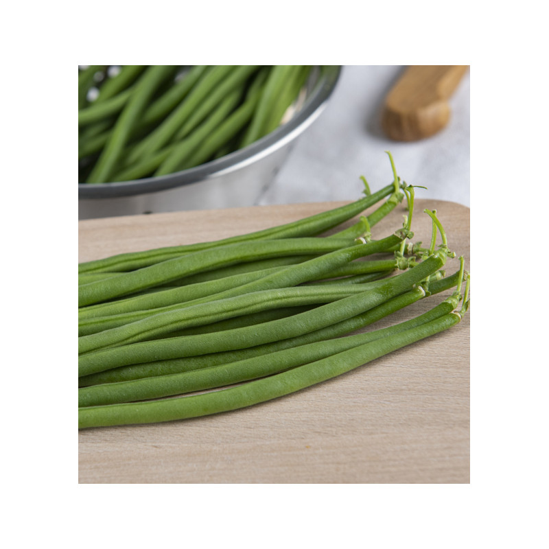 Variété provençale particulièrement adaptée aux périodes estivales intenses. Gousses très fines (Ø 7/9 mm) et sans fil, longues de 15 à 17 cm, vert foncé, lisses et droites, faciles à récolter.