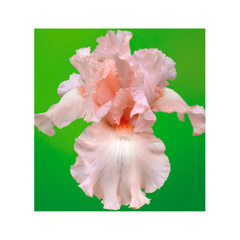 Fleur romantique au délicat coloris rose pâle. Pétales fortement plissés, portant une barbe mandarine.