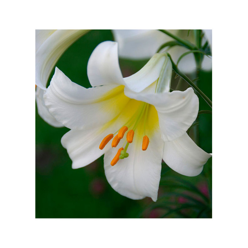 Ce Lis ‘Royal’ offre de très grandes fleurs divinement parfumées, d’un magnifique blanc pur éclairé de jaune citron en son centre.
