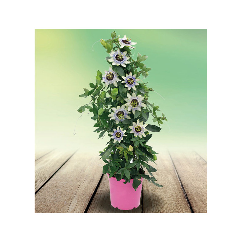 Ses magnifiques fleurs blanches et bleues sont très caractéristiques, elles se renouvellent tout l’été sur des tiges fines, qui partent vigoureusement à l’assaut d’un support solide, un grillage ou une pergola.