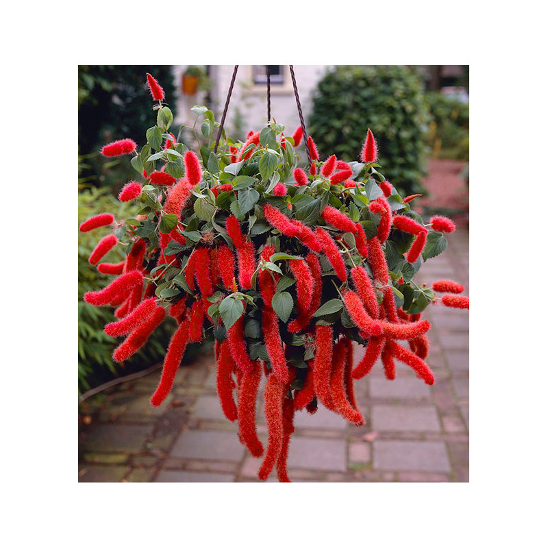 ACALYPHA HISPIDA. Appelée aussi ‘Ricinelle’ ou ‘plante chenille’, cette plante originale produit de longs chatons velus rouge lumineux. Son feuillage est robuste et vert foncé.