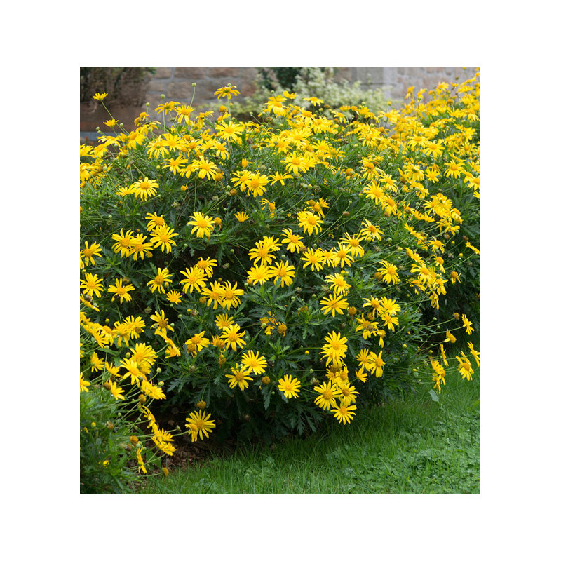 Vivace et rustique, cette touffe buissonnante aux innombrables fleurs jaune d’or, prolonge sa floraison jusqu’au coeur de l’automne par temps doux. Feuillage persistant décoratif finement découpé, vert brillant. Plante robuste et de culture facile, remarquable en massif et en jardinière. Sol ordinaire, bien drainé.
